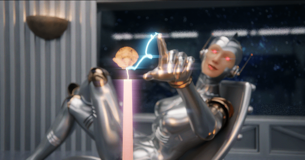 Here a couple of test renders I did, though I’m still not 100% percent happy with the look, and the robot woman design. So I still might go back to the design stage and work a bit more on her before finishing the ad.